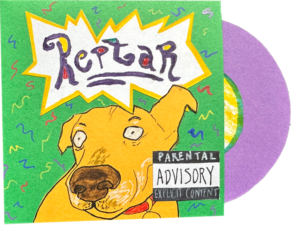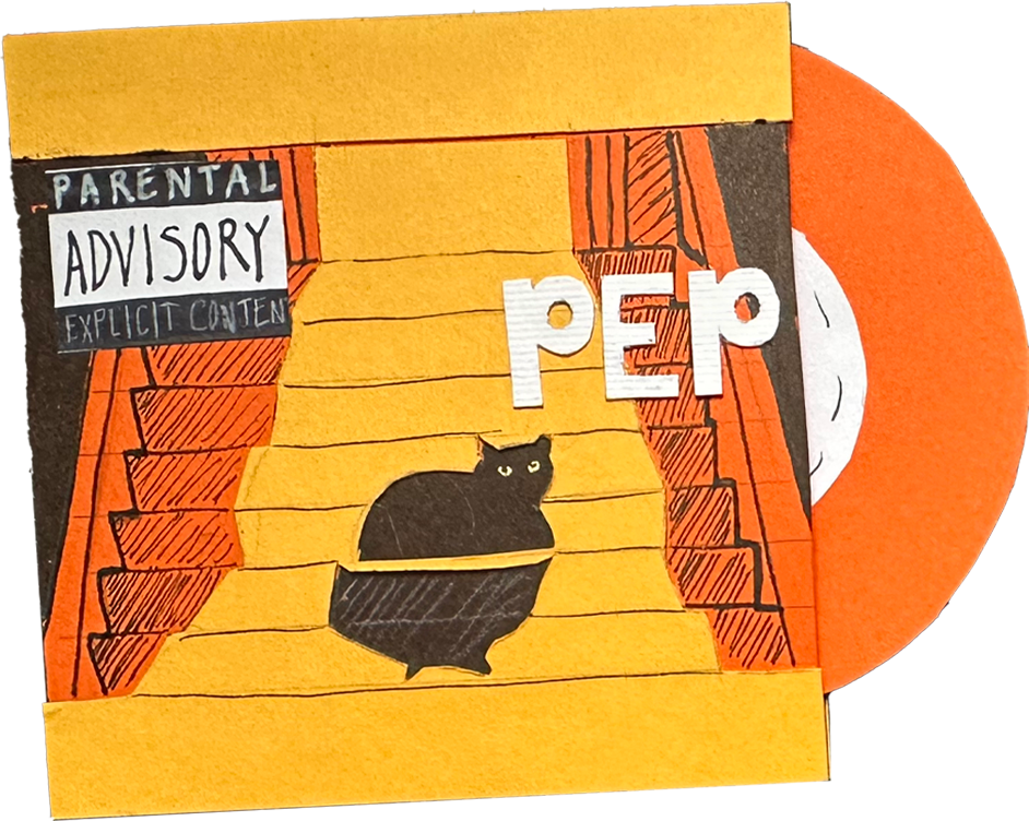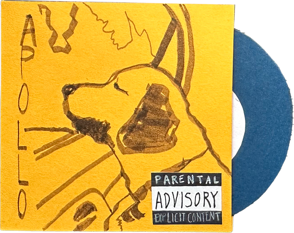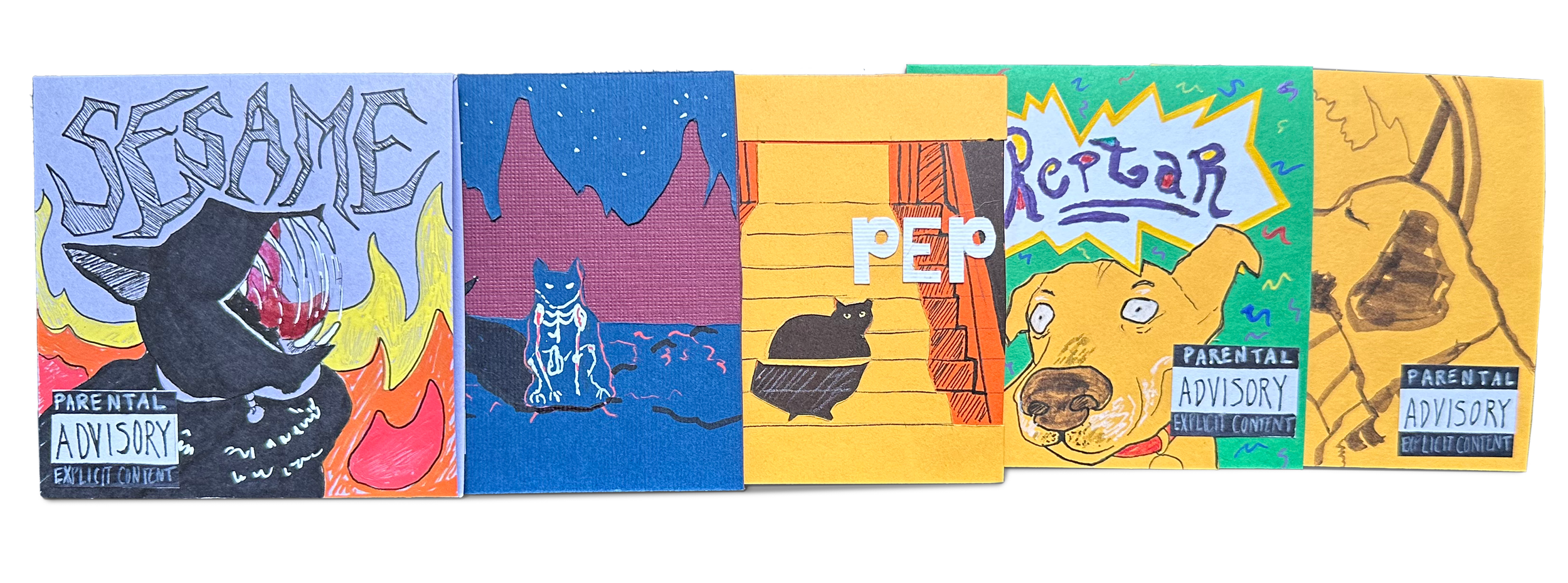 I made mixed media illustrations featuring my partner's and my pets, styled as various album covers.